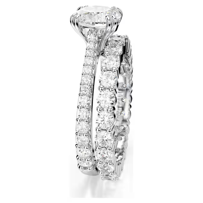 Maak dagelijkse looks speciaal met deze ringenset met rodium toplaag uit de Stilla-lijn. Elk sieraad is geïnspireerd op verfijnde sieraden: een ring bevat een heldere steen met princess-slijpvorm en kristalpavé op de rijen, en de andere ring bevat een rij van schitterende stenen langs de band. Een prachtig cadeau voor een dierbare (of uzelf).