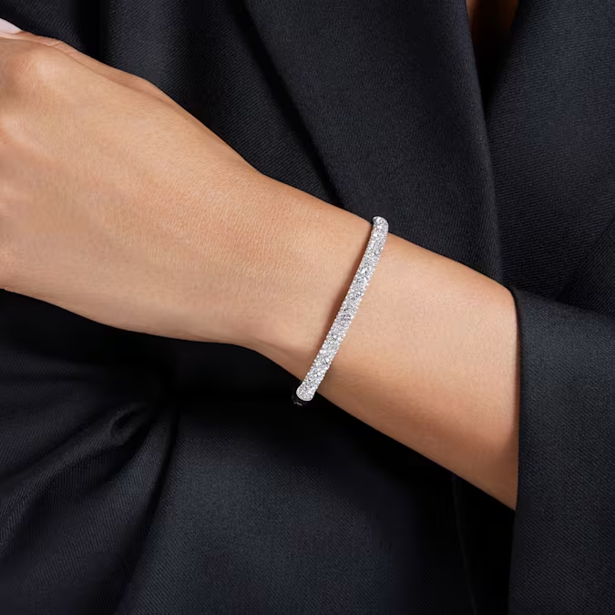 Deze oogverblindende Sublima-armband strooit sterrenstof over uw outfit. De band met rhodium toplaag wikkelt zich elegant om de pols en is aan de bovenkant voorzien van een sneeuwpavé van heldere rondgeslepen kristallen. Voor een wonderschoon en verfijnd accent bij uw dagelijkse look.