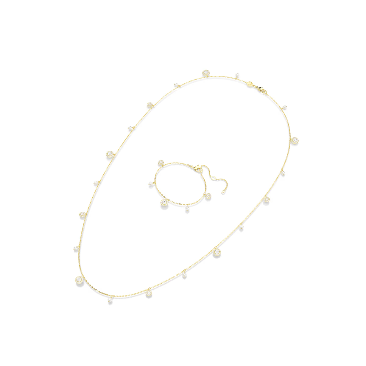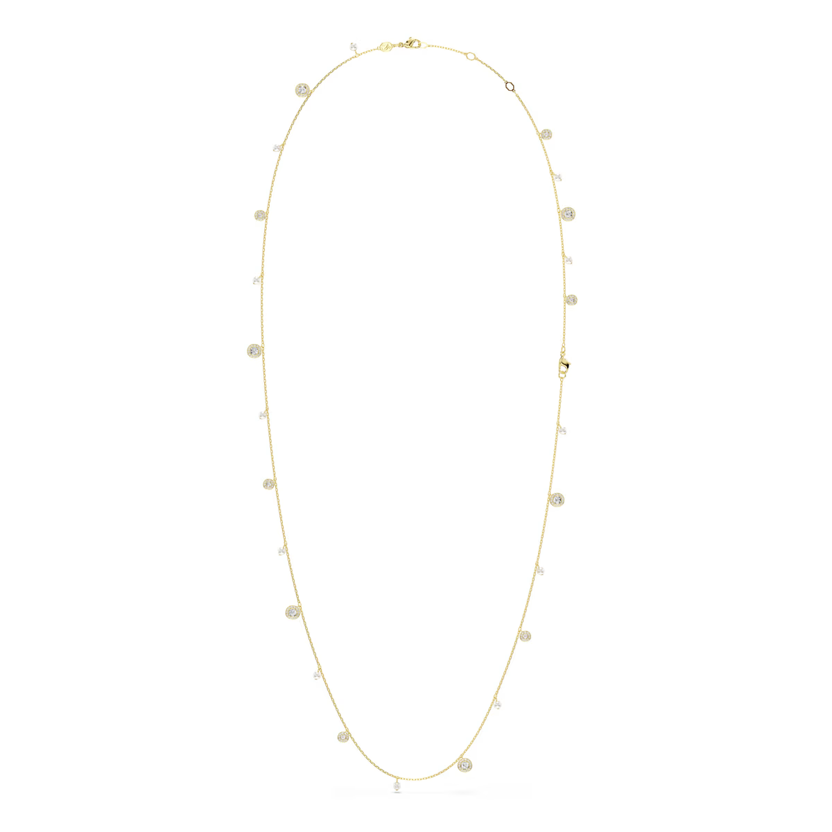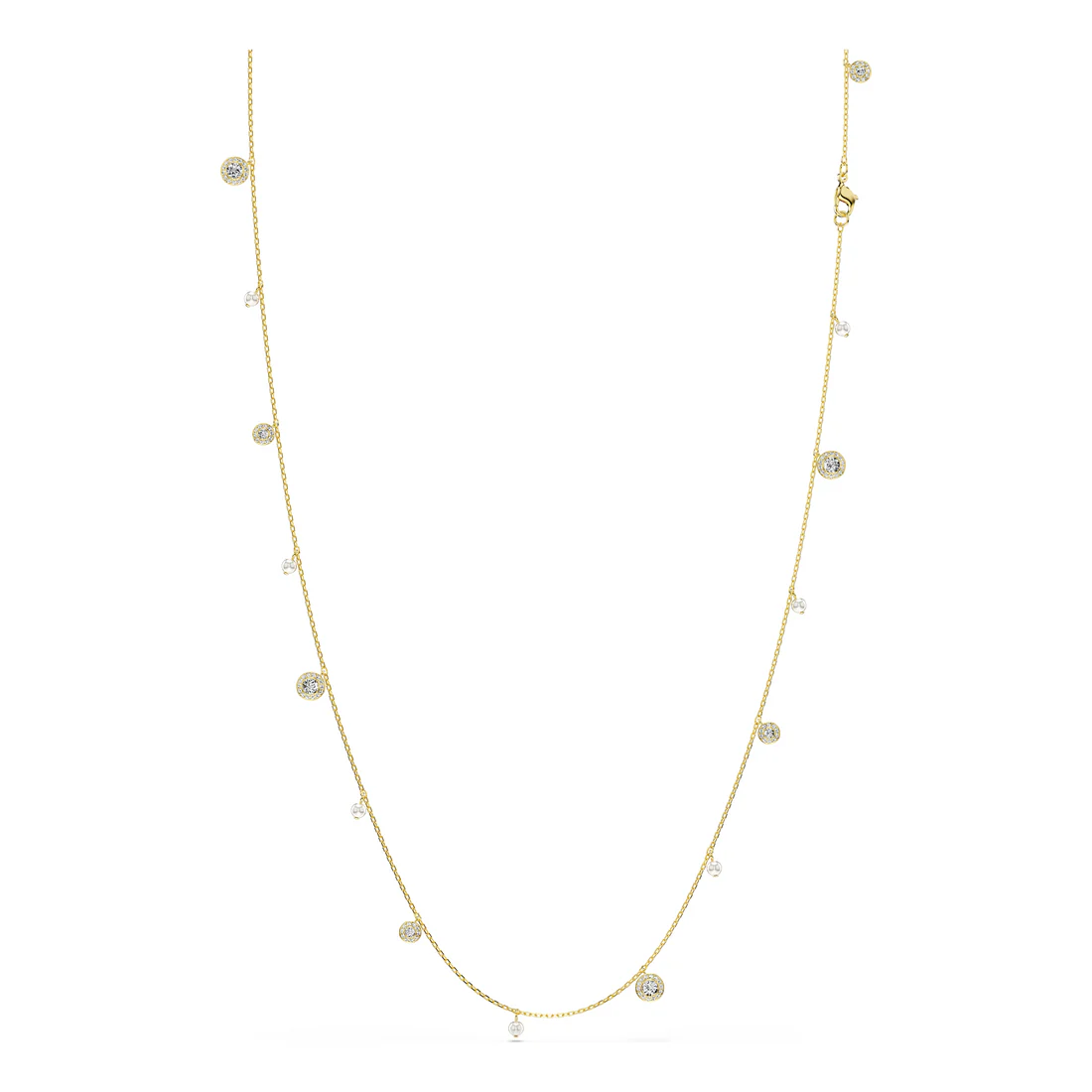 Veelzijdigheid schittert in dit Una-sieraad met goudkleurige toplaag, dat kan worden gedragen als een lange ketting of kan worden ingekort tot een middellange ketting en een delicate armband. Hoe u het ook draagt, de afwisselende combinatie van Swarovski Crystal Pearls en ronde motieven zal uw stijl voorzien van luxe en licht.