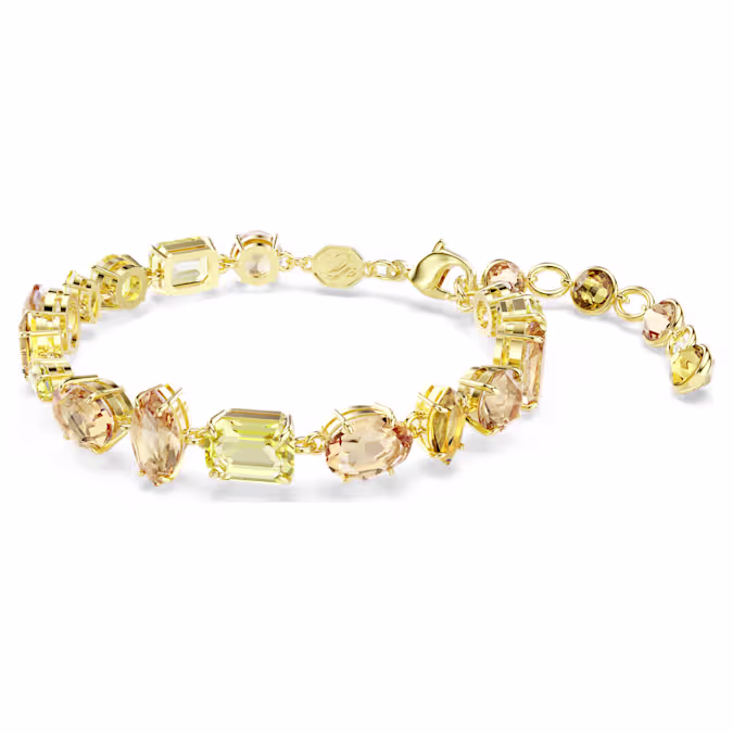Deze Gema-armband is gemaakt met uitbundige kleur en licht en is een levendig statement stuk. Het ontwerp met goudkleurige toplaag heeft een mix van kristallen in klauwzetting in verschillende slijpvormen en gele en amberkleurige tinten, terwijl u met de versierde extender de pasvorm gemakkelijk kunt aanpassen. Deze armband is symbolisch voor de onverwachte vormen en levendige schoonheid van de Gema-lijn en straalt nog helderder wanneer hij wordt gedragen met bijpassende sieraden uit dezelfde lijn.