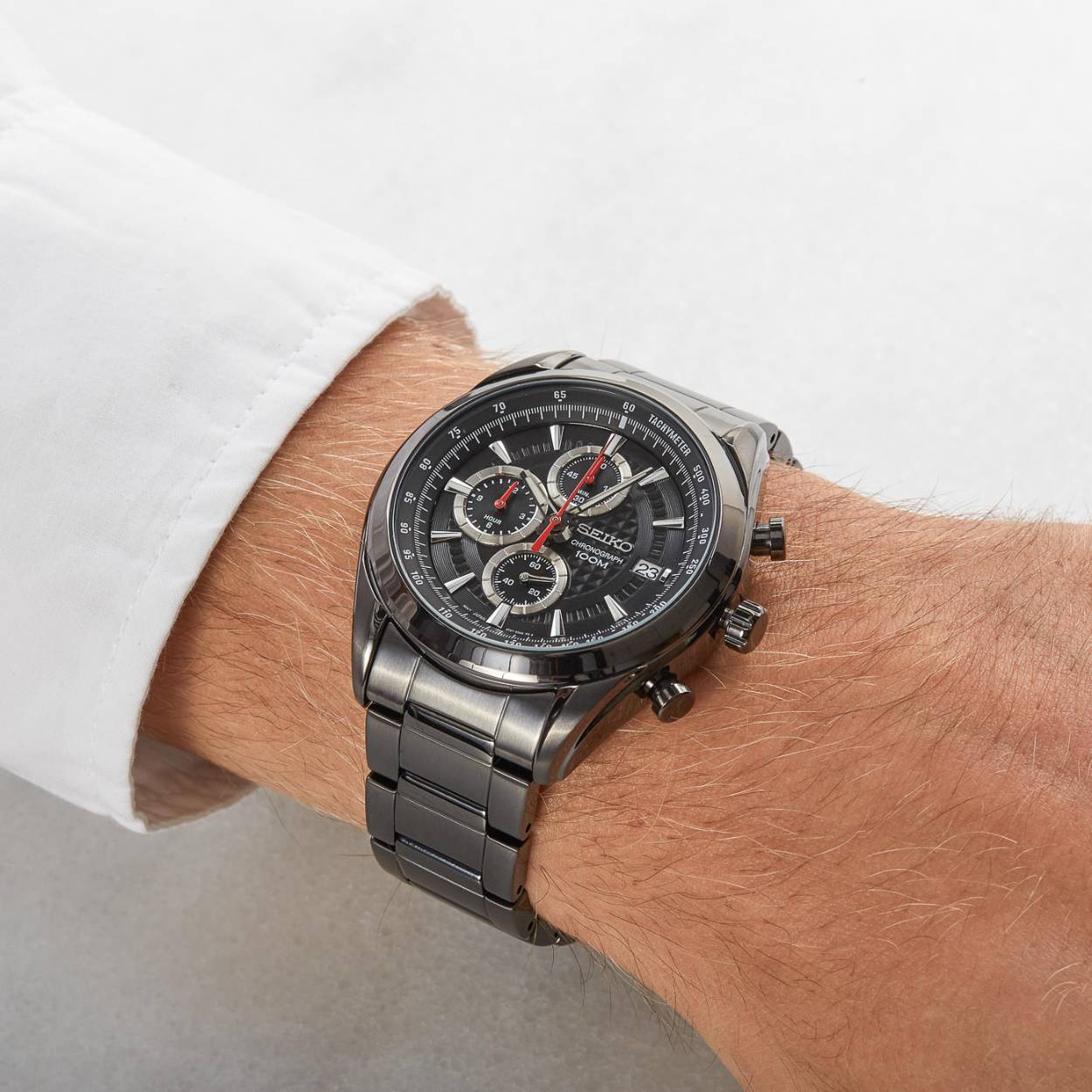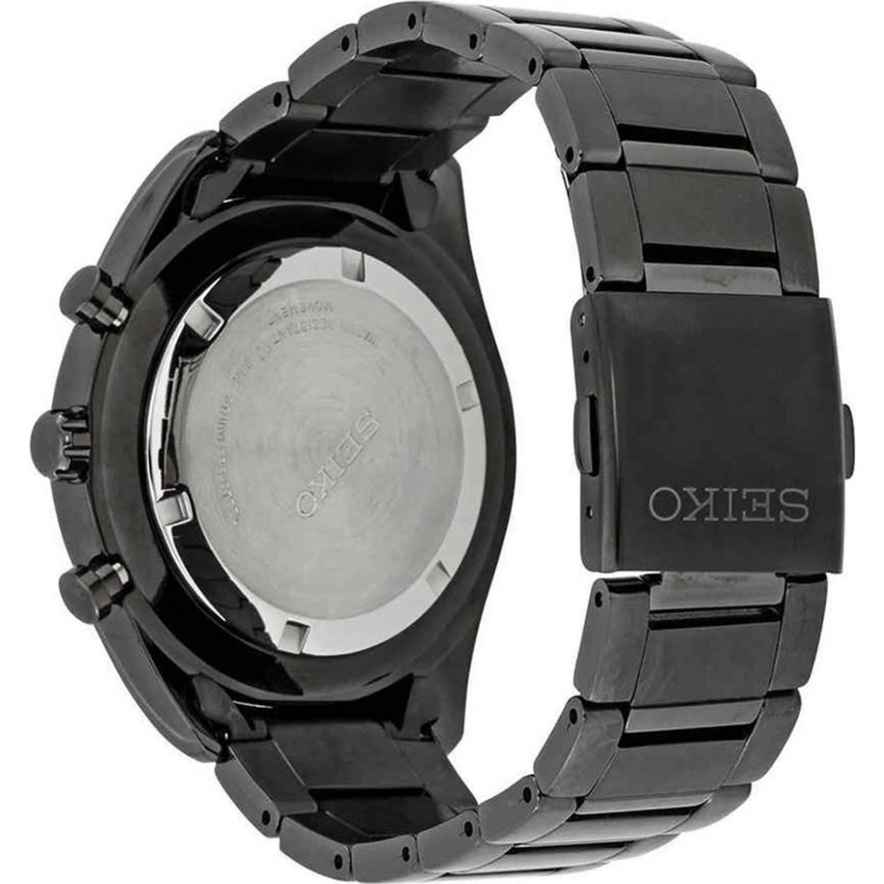 Dit herenhorloge is van het merk Seiko. Het is een chronograaf horloge gemaakt van hardcoated staal. De diameter van de kast is 44.9 mm en de kast is 12.1 mm dik.