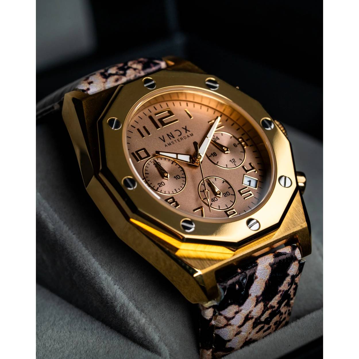 Maak een statement met The One Snake Goud Beige van VNDX Amsterdam. Dit horloge combineert tijdloze elegantie met hoogwaardige materialen, luxe details en een opvallende leren band met snakeprint. De gouden kast en de verfijnde beige wijzerplaat vormen een perfecte balans tussen stijl en eenvoud, terwijl de unieke band een gedurfde en moderne twist toevoegt. Een veelzijdig horloge dat zowel dagelijks als bij speciale gelegenheden indruk maakt.