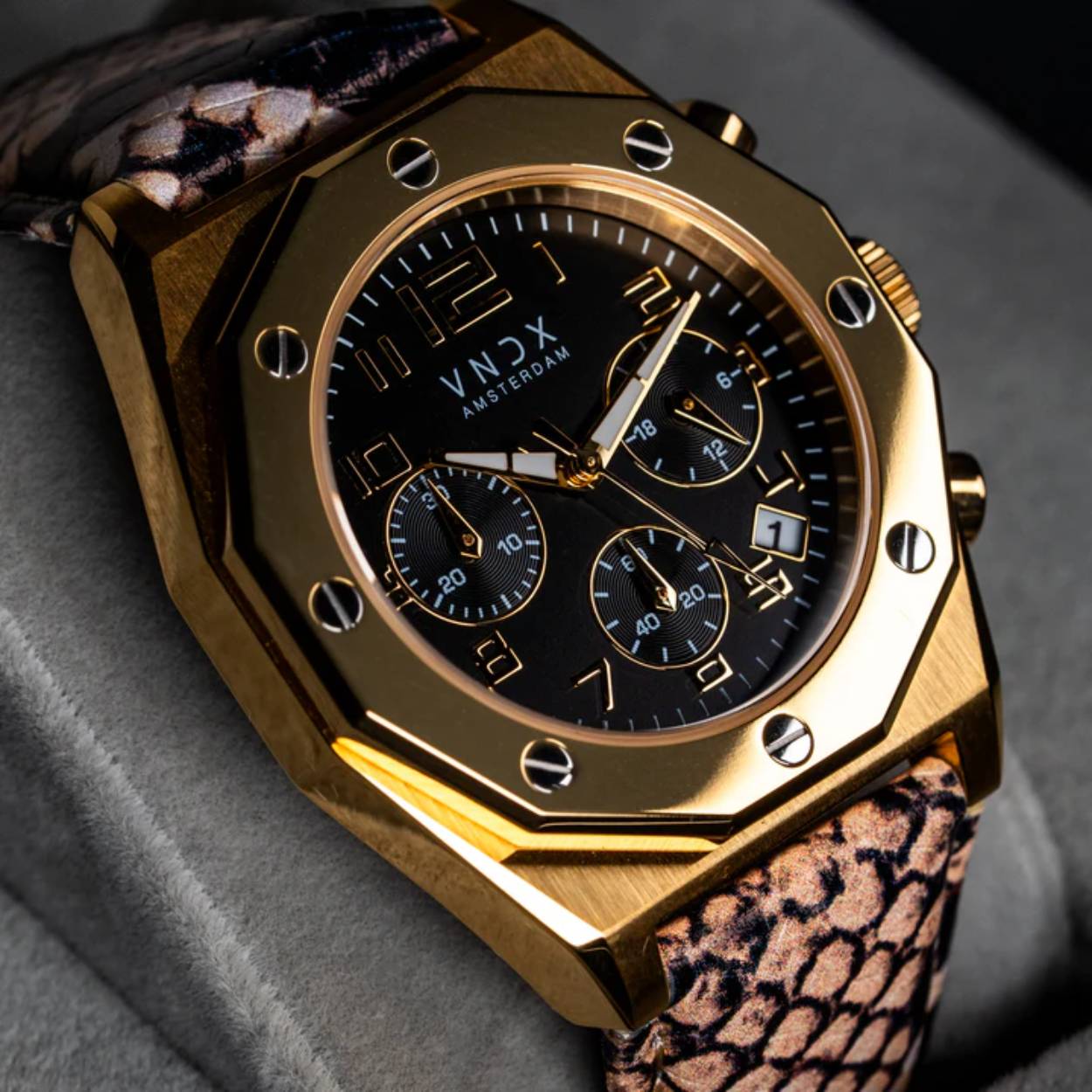 Maak een statement met The One Snake Goud Zwart van VNDX Amsterdam. Dit horloge combineert tijdloze elegantie met hoogwaardige materialen, luxe details en een opvallende leren band met snakeprint. De gouden kast en de verfijnde zwarte wijzerplaat vormen een perfecte balans tussen stijl en eenvoud, terwijl de unieke band een gedurfde en moderne twist toevoegt. Een veelzijdig horloge dat zowel dagelijks als bij speciale gelegenheden indruk maakt.