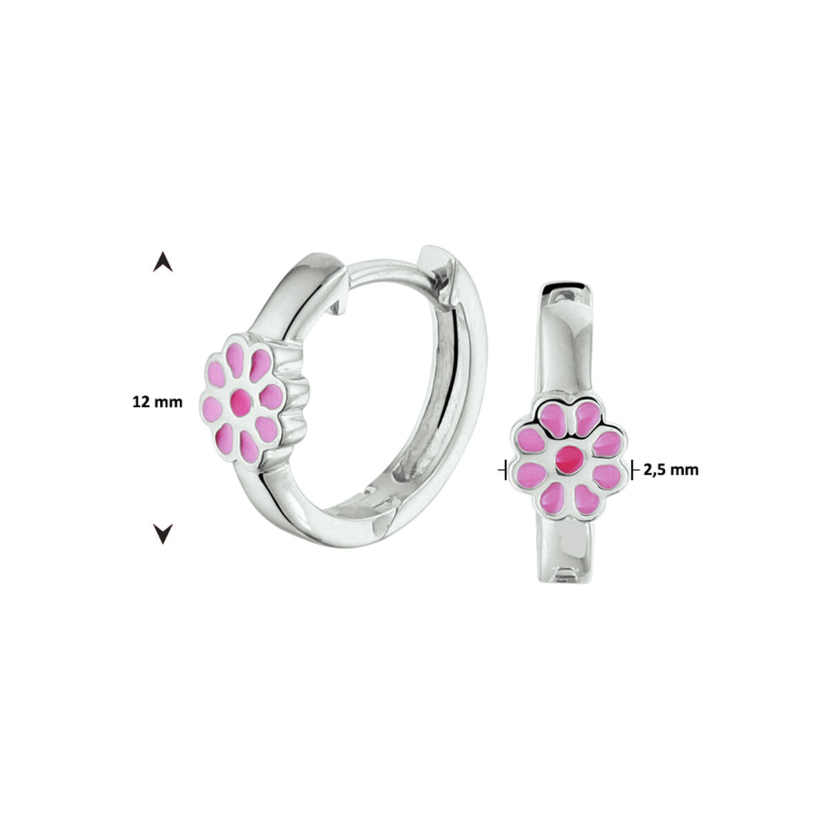 Gerhodineerd 925 zilveren oorringen uitgevoerd met een bloem. De oorringen hebben een afmeting van 12x2.5mm.